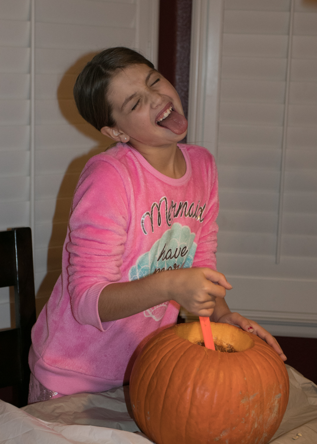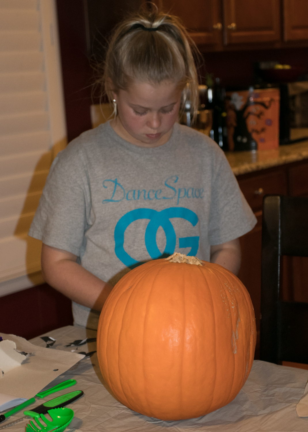 The girls’ pumpkins found their way to the porch. Annabelle was eager to rake some leaves, but we had very few fall off the trees yet.
