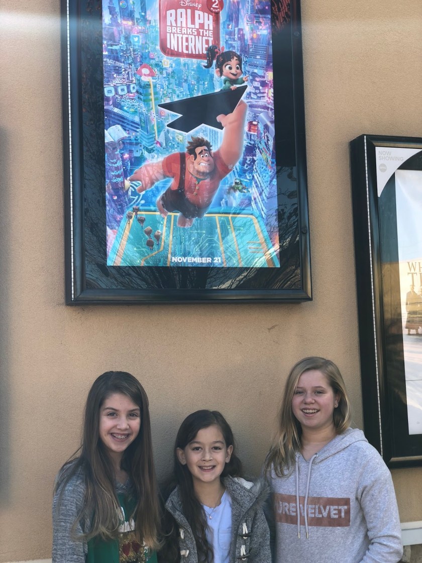 The girls each had a friend join us for a movie this morning. We went to see Wreck It Ralph 2, which I was actually pretty excited about because I thought the first one was really cute. About 10 minutes in I feel asleep! Oh my! I don’t know if it was a reflection of the movie or the fact that this time of year is just exhausting. I don’t think I slept long, but I did get a nice little nap out of it.
